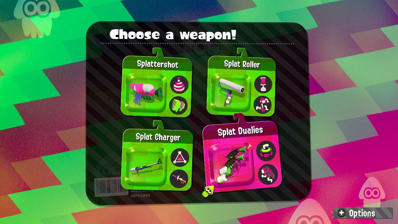 The beta is quite limited, but still very fun. After a quick tutorial, you’re giving the choice between four weapons, the Splattershot, Splat Roller, Splat Charger, and the new Splat Dualies (which I love!). Pick a weapon, and you’re taken straight to a game lobby with a randomly chosen map. The Reef and Musselforge Fitness are the current maps.